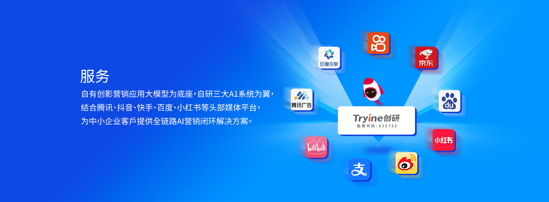 公司以自有創影(yǐng)營銷應用大模型為底座,依托自研的三大AI係統,全(quán)麵接入(rù)DeepSeek R1滿血(xuè)版,全鏈(liàn)路營銷場景深度應用,結合騰訊、抖音、快手、百度、小紅(hóng)書等頭部媒體平台,為中小企業客戶提供“從項目(mù)評估、創意創作、內容生產、策略製定、智能投放到效果分(fèn)析優化一體(tǐ)化”的全鏈路AI營銷閉環解決方案,實現精(jīng)準營銷(xiāo)與(yǔ)智能決策。